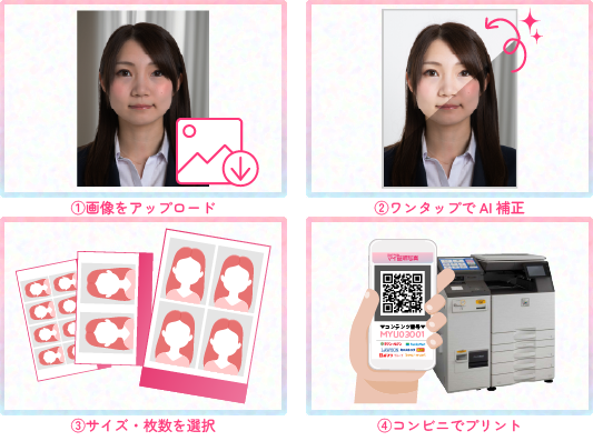 ①画像をアップロード ②ワンタップでAI補正 ③サイズ・枚数を選択 ④コンビニでプリント ※全部を同じ写真にすることも、1枚ずつ違う画像にすることも可能です。(金額は変わりません)
